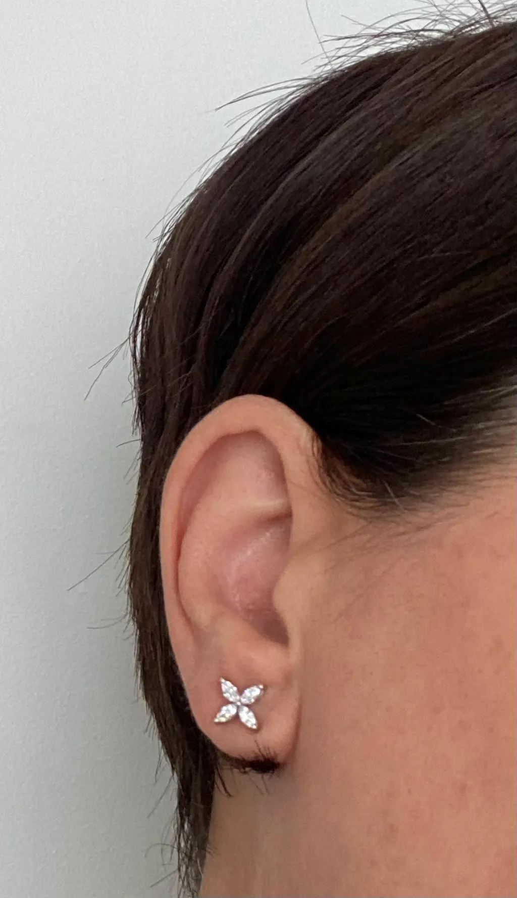 Flower stud gold earrings with marquise diamond accents.