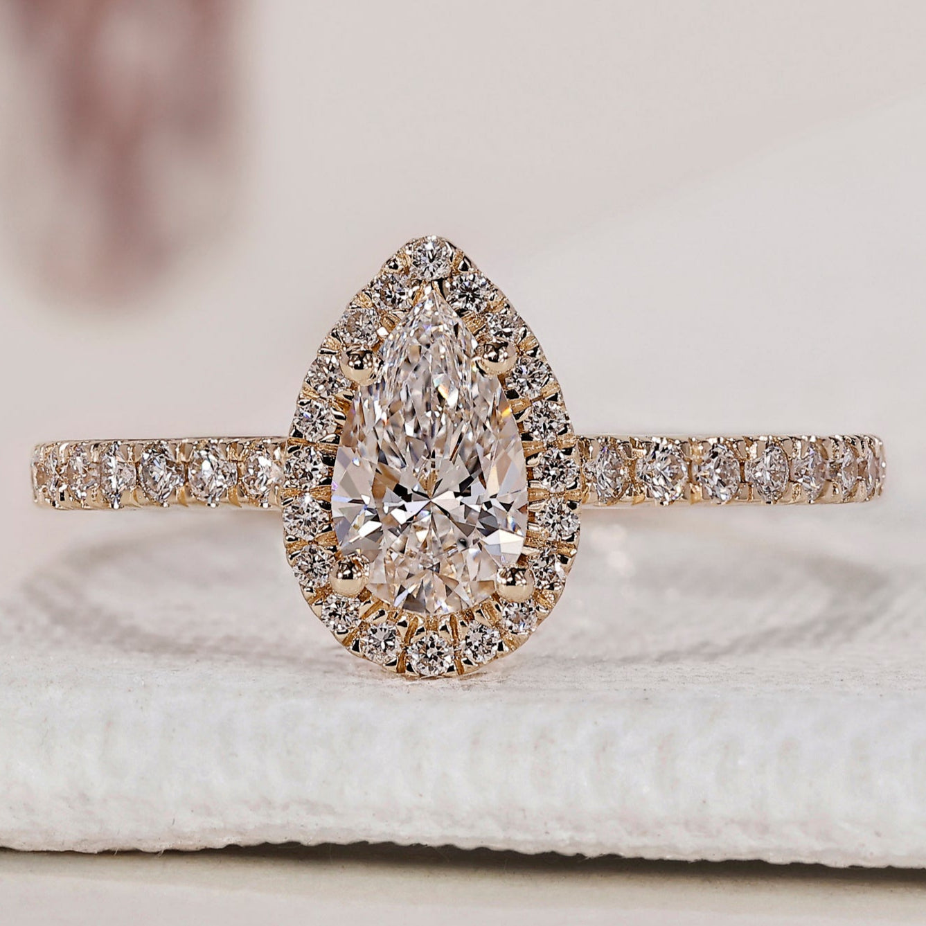 Pear Shaped Engagement Ring with a stunning halo diamond ring design.