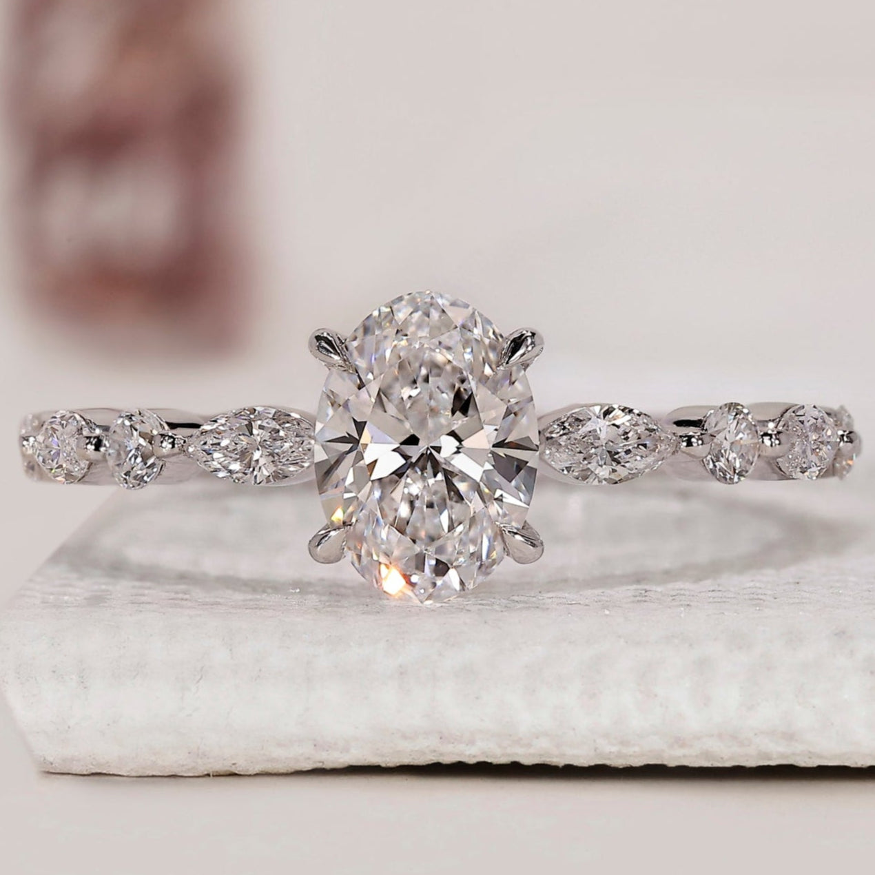 Oval diamond engagement ring crafted with marquise and round side stones in white gold.