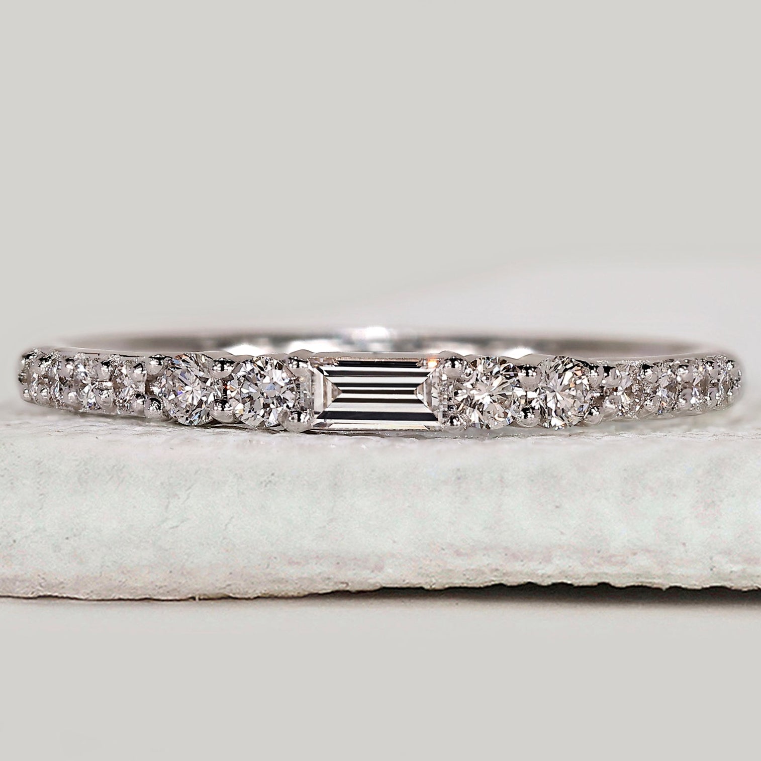 Baguette and round diamond band in white gold.