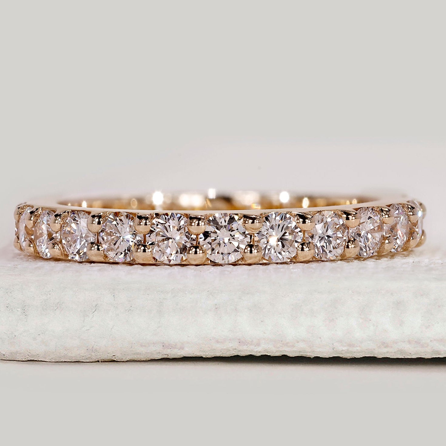 Yellow gold eternity band with round diamonds.
