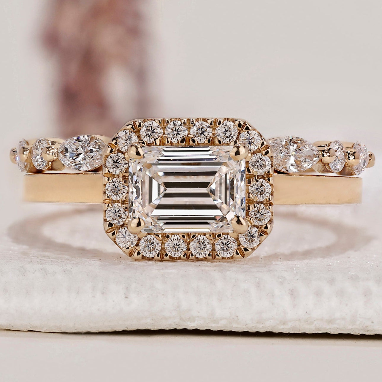 Emerald Ring with Wedding Band Yellow Gold Bridal Set