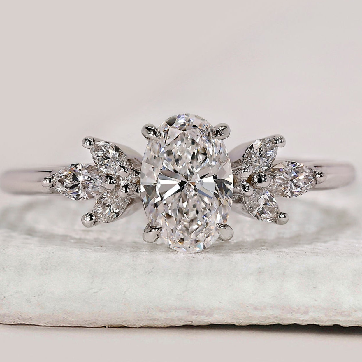 Oval cut diamond ring with marquise side stones.