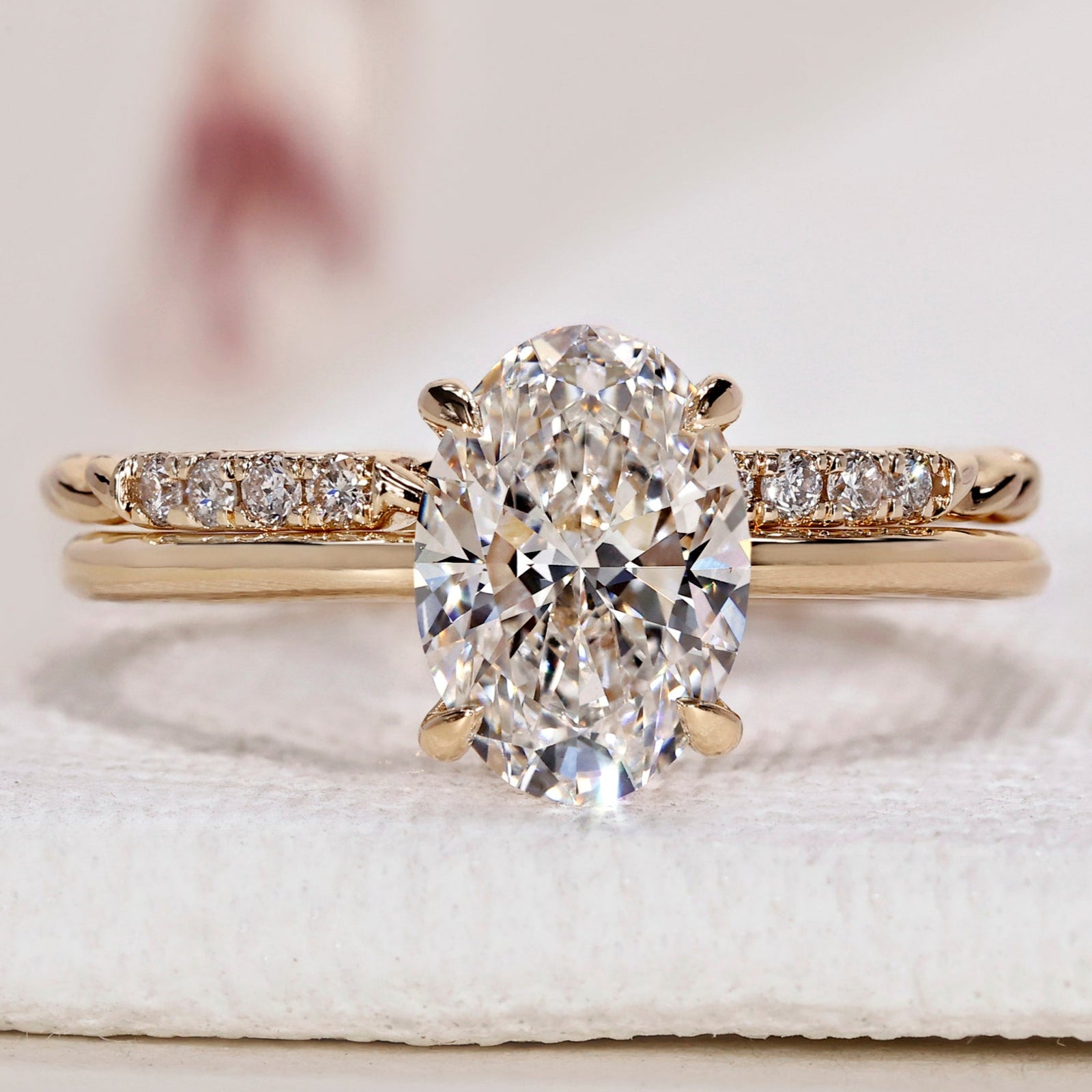 Oval engagement ring with wedding band in a classic design.