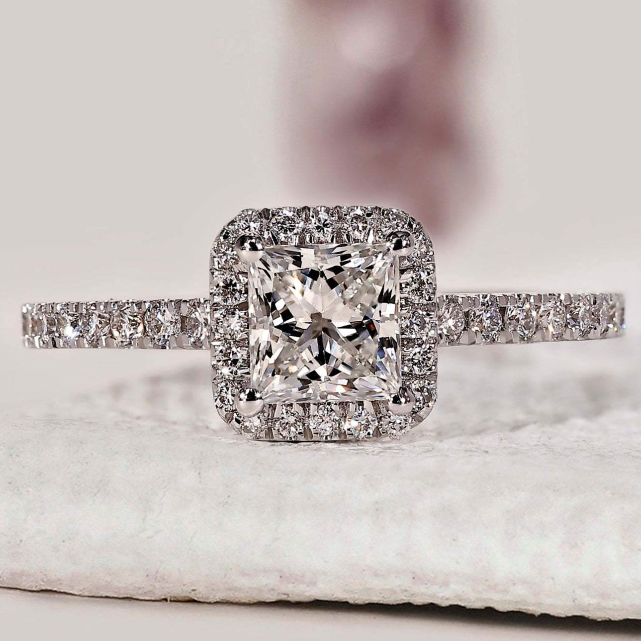Princess Cut Engagement Ring With Halo and Pave Setting
